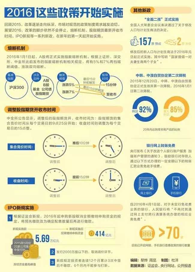 回顾2015,改革逐渐走向纵深,市场对规范的政策制度需求越发迫切。展望2016,改革的脚步依然不会停止,熔断机制、股指期货最新开收市时间、IPO新规等一系列新政,在新年的第一天起开始实施。